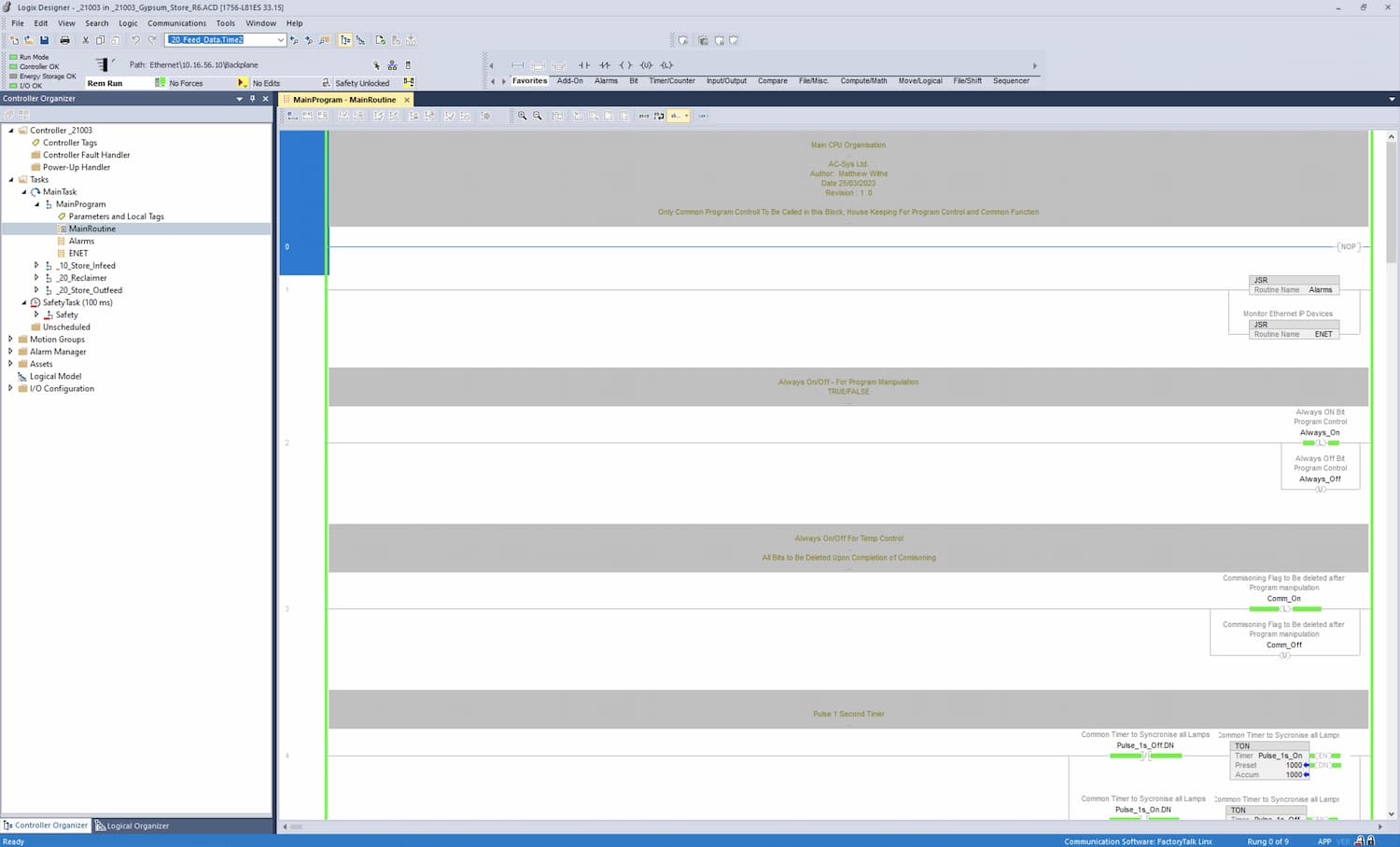 At AC Sys our PLC programming is produced to the strictest engineering standards. This is a core business aim: To ensure full transparency of the control logic, that is viable and maintainable by the end user. We don’t lock down code and ensure every network, operand and function is fully documented and commented, I/O is descriptive, and logic is structured into modular, organised blocks. We implement layered architecture (device, control, sequencing, safety) so responsibilities are clear, change impact is minimised and commissioning is simplified. Field bus communications and protocols are defined and verified, and version control with release notes ensures traceability.